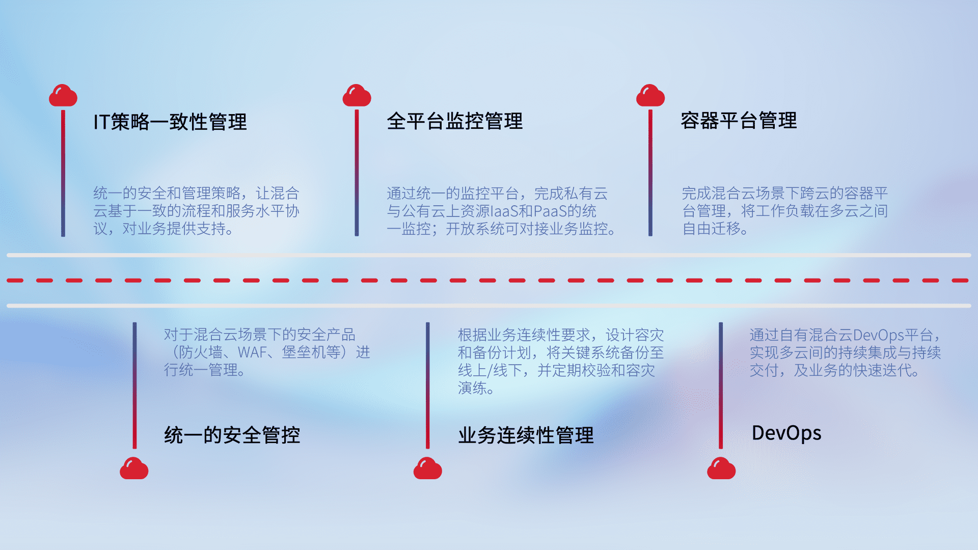 通过多云纳管,,,以统一的资源数据模型把客户的云资源进行抽象和封装,,进而实现对多云资源的统一操作,,,保障云资源管理的可靠性、、、、稳定性与可用性。。量身定制化运维内容,,,配置、、开发运维、、、、补丁管理、、备份、、、监控、、、认证和访问管理、、、、审计和日常巡检等,,,,保障在用云过程中的可靠度,,稳定度以及高可用率。。
