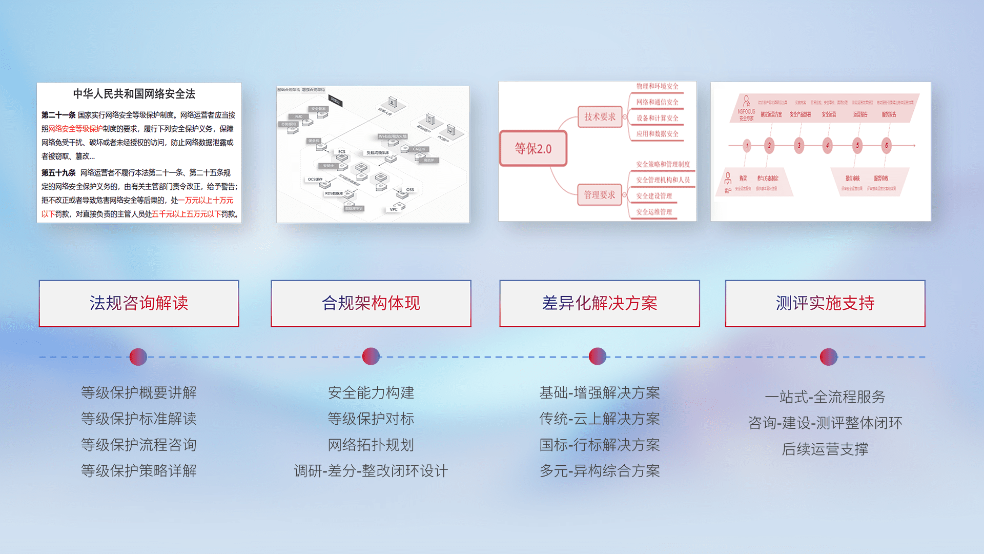 通过专业的法律咨询解读、、、合规架构体现、、、、差异化解决方案、、、、测试实施支持等服务,,为客户量身打造等保合规体系。。。